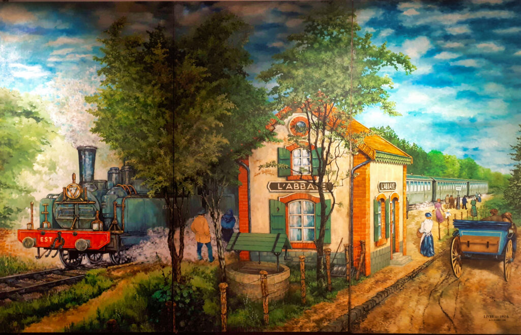 Dans la même logique de sauvegarde, lorsqu’elle apprend l’arrêt de l’activité du restaurant La Main Blanche, situé à l’angle de l’avenue Paul-Bert et de l’avenue Vauban, elle intervient comme négociatrice auprès du propriétaire afin de récupérer une peinture — un triptyque de grand format — fixée au mur de l’établissement, représentant l’ancienne gare de l’Abbaye, dans l’objectif d’éviter la perte de cette représentation du patrimoine local. Elle participe elle-même, afin de s’assurer de la mise en œuvre effective, à la restauration et au nettoyage de ce triptyque de grand format, aujourd’hui conservé au Château de la Forêt.