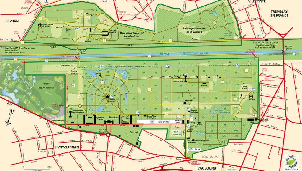 L’accessibilité piétonne et cyclable est assurée par une multiplicité de portes réparties autour du périmètre. Deux polarités concentrent cependant l’essentiel des flux visiteurs : la porte de Sevran au pont de l’Ourcq et l’entrée à proximité des parkings principaux côté Livry-Gargan/Vaujours. Deux secteurs ne sont pas ouverts au public : le Bois de la Tussion au nord-est, fermé depuis avril 2000 en raison d’un aléa naturel de dissolution du gypse et de risques d’effondrement ; un secteur écologique au sud-est, maintenu en zone de quiétude et de protection, non accessible afin de préserver des habitats sensibles.