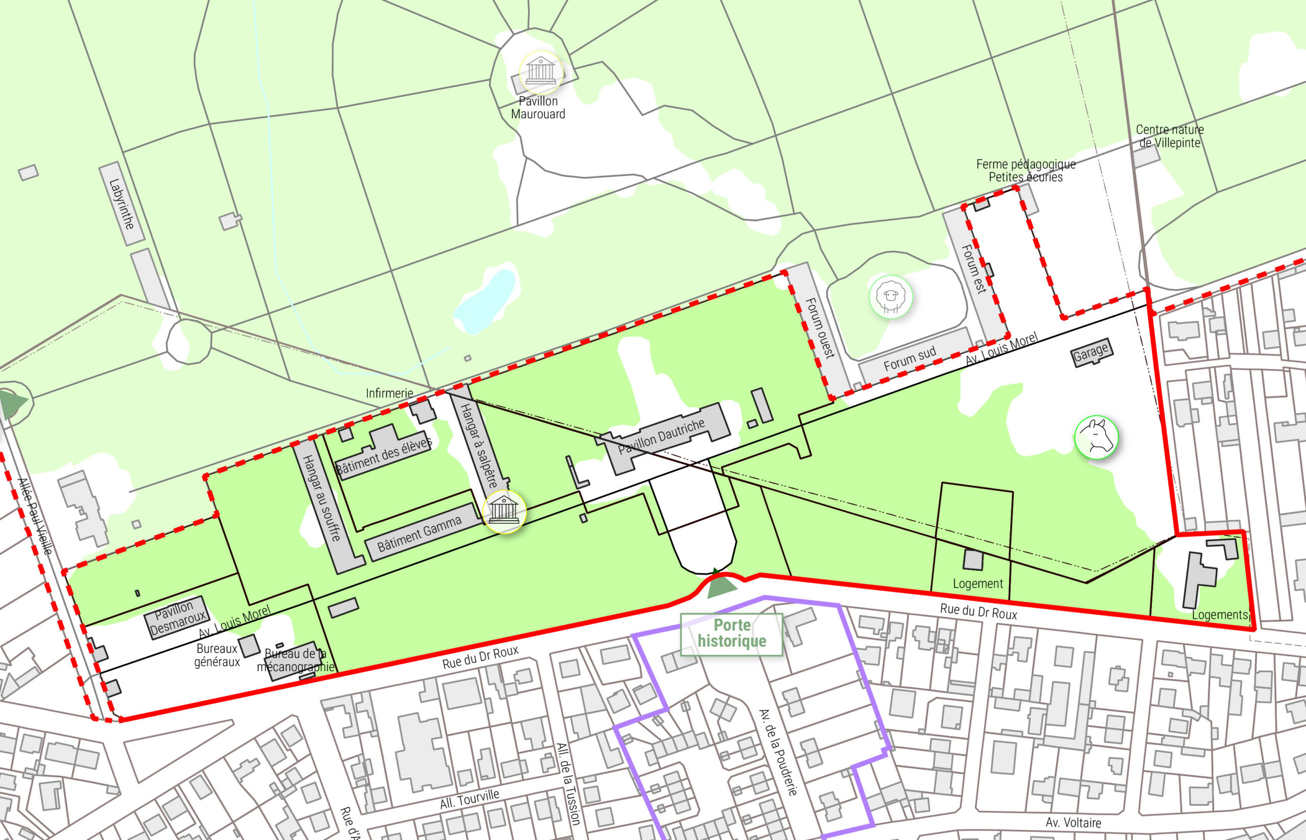 – les actions dans son périmètre immédiat (requalification des limites et accès, hiérarchisation des déplacements, activités à développer).